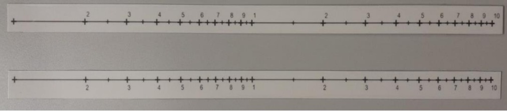 Apesar das réguas apresentarem tamanhos diferentes, por meio de leituras e de cálculos realizados, observamos que a escala dos números, em específico, é utilizada com tamanhos iguais, para que sejam efetuados os cálculos de maneira correta. É válido destacar que foram escolhidas 10 marcações com números decimais para realizar a graduação da escala, isso ocorreu devido ao objetivo de o artigo não ser apresentar a construção da escala, mas explicar ao leitor como ocorre a operação de multiplicação utilizando as réguas. Sendo assim, não será possível obter o resultado preciso da multiplicação de muitos exemplos, entretanto, na impressão reversa da régua Transversarie (Figura 3) o leitor consegue encontrar a escala dos números precisamente graduada.