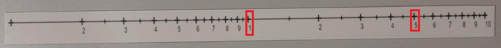Para entendermos o processo de manipulação das réguas vamos analisar as partes desse trecho detalhadamente. Inicialmente, Oughtred (1639) expõe que será estabelecida uma relação de proporcionalidade entre as réguas, sendo assim, o leitor que está com o instrumento em mãos deve segurar a régua Transversarie na sua mão esquerda e a régua Staffe na direita. Em seguida, deve procurar na Transversarieo primeiro termo da multiplicação e o outro que Oughtred chama de “homogêneo”, isto é, que possui a mesma grandeza. Então, se queremos multiplicar 5 por 4, e considerando a informação dita na sessão anterior de que o primeiro termo da proporção implícita é sempre 1 na operação de multiplicação, então procuraremos na Transversarieos números 1 e 5 (Figura 8).
