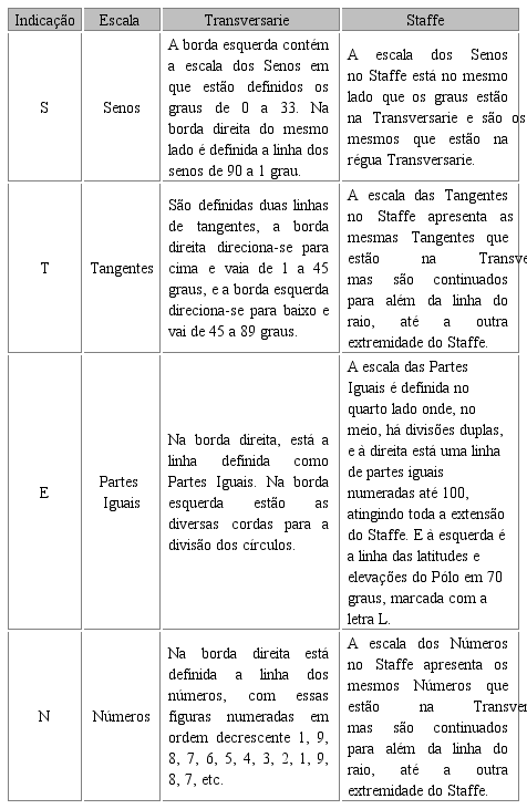 Na descrição das escalas, podemos observar que é mencionado o termo “linha do raio”, que, durante a formulação desse estudo, supomos se referir a metade das réguas retratadas. Outro fato importante de ser relatado refere-se às escalas dos senos, tangentes e números presentes na régua Staffe que são as mesmas presentes na régua Tranversarie. Entretanto, como a Staffe apresenta um comprimento mais alongado, as graduações são continuadas para além da linha do raio.