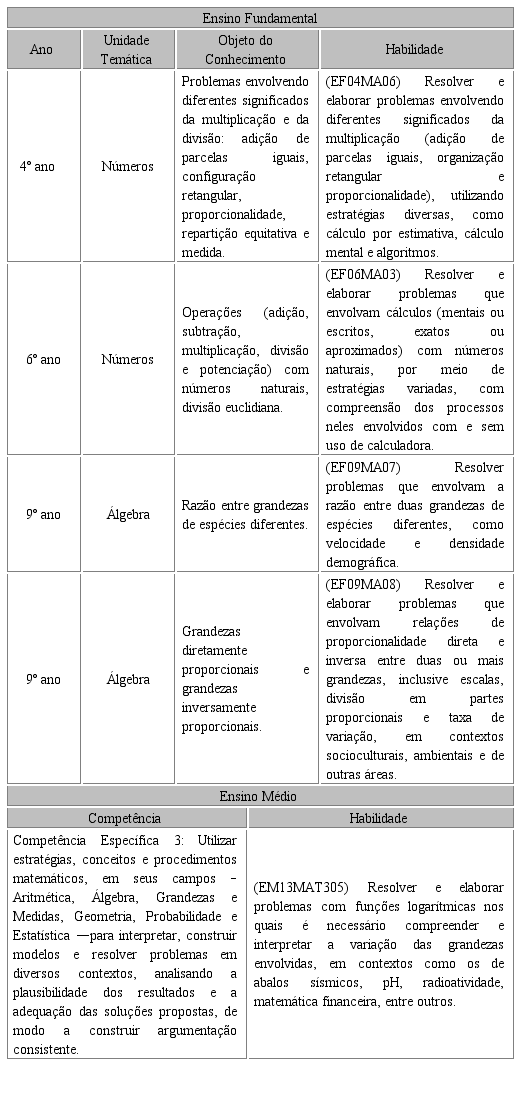 Nessa pesquisa, dentre as operações estudadas no Ensino Fundamental e Médio, observamos que a multiplicação é um objeto de conhecimento da unidade temática Números, proposta na BNCC, inicialmente apresentada no 2. ano do Ensino Fundamental. Segundo Brasil (2017, p. 283), ela está vinculada com problemas envolvendo adição de parcelas iguais, tendo como habilidade “resolver e elaborar problemas de multiplicação (por 2, 3, 4 e 5) com a ideia de adição de parcelas iguais por meio de estratégias e formas de registro pessoais, utilizando ou não suporte de imagens e/ou material manipulável”.