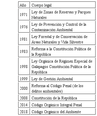 Unas de las respuestas que promovió el Estado para atender la mencionada conflictividad generada por la explotación de los recursos del subsuelo, fue el paulatino desarrollo de una institucionalidad y normativa de protección del ambiente. Se destaca la expedición de la Ley de Zonas de Reservas y Parques Naturales (1971), la Ley Forestal y de Conservación de Áreas Naturales y Vida Silvestre (1981) y la creación del Instituto Nacional Forestal y de Conservación de Áreas Protegidas (INEFAN) en 1992; igualmente la reforma constitucional del año 1983, que por primera vez incluyó el derecho de la población a vivir en un ambiente sano y libre de contaminación (Serrano, 1988); la creación del Ministerio de Medio Ambiente (1996), luego llamado Ministerio del Ambiente, y la expedición de la Ley de Gestión Ambiental (1999). El instrumento de política pública ambiental más significativo, orientado a tutelar los espacios naturales y la biodiversidad fue la declaración de áreas naturales protegidas sobre determinados espacios del territorio con el fin de reconocer sus atributos biológicos y preservarlos del impacto de actividades humanas. Si bien el Parque Nacional Galápagos había sido la primera área protegida creada en Ecuador en 1936 y la Ley para la Preservación de Zonas de Reserva y Parques Nacionales promovió la declaración de varios espacios naturales bajo esta categoría de manejo, la protección que con ellas se buscaba se potenció con el establecimiento del Patrimonio de Áreas Naturales del Estadoque precisó las limitaciones de derechos reales sobre dichas áreas y la exclusión de actividades que las degraden.