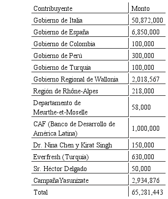 A finales de 2012, el total de contribuciones efectivamente recibidas ascendió a 6 y medio millones de dólares. Estas fueron aportadas por 18 contribuyentes, entre ellos los gobiernos de: Chile, Colombia, Georgia, España, Italia y Turquía, los gobiernos regionales de Wallonia (Bélgica), Meurthe-et-Moselle (Francia), Rhône-Alpes (Francia) y Limousin (Francia); así como ONGs, empresas privadas y particulares (Informe del Fondo Fiduciario Yasuní ITT, 2012). En tanto que, para agosto de 2013, cuando el Gobierno Nacional decide dar por terminada la iniciativa, el monto recaudado por el Fideicomiso Internacional ascendió alrededor de 11 millones de dólares y en el fondo nacional administrado por la Corporación Financiera Nacional se habían recibido contribuciones por un poco más de 2 millones de dólares, esto es, una cifra aproximada total de 13 millones y medio de dólares.