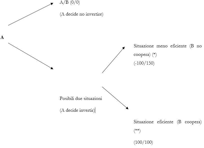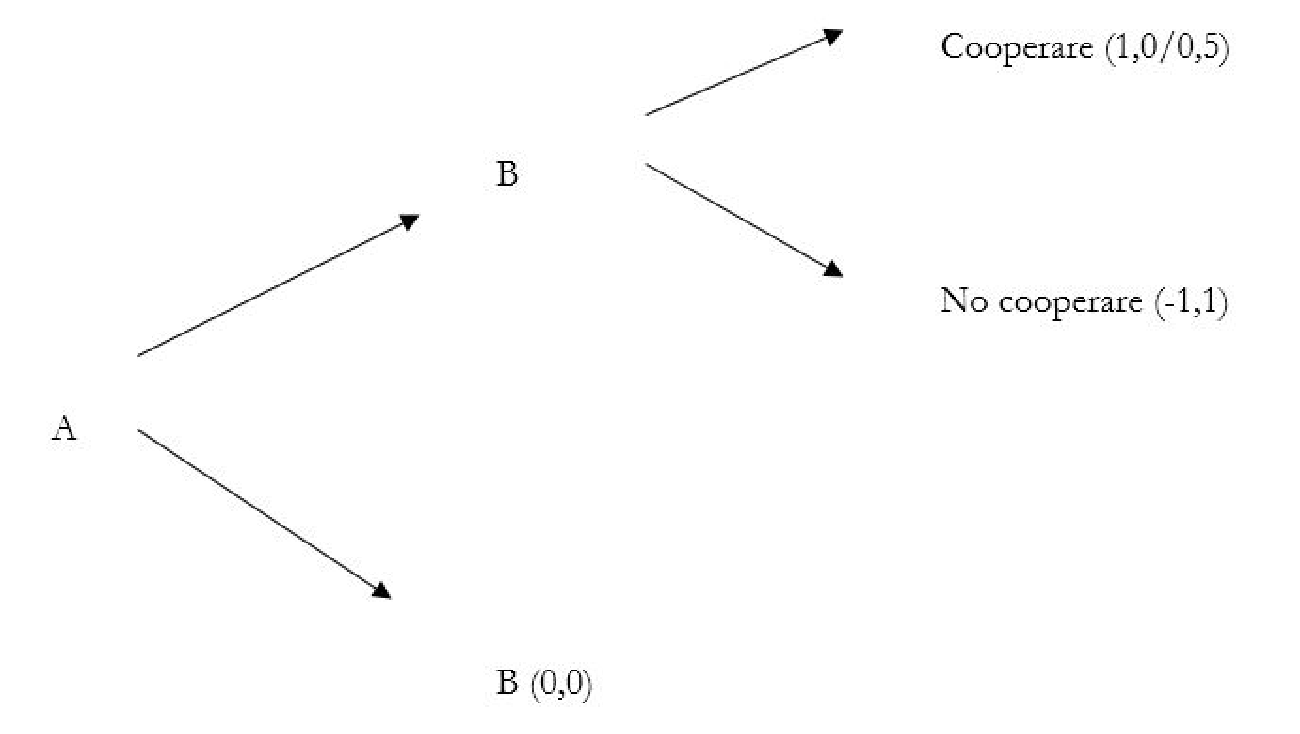 b) Non collaborare. In tal caso “B” manterrà la macchina e guadagnerà la somma di 1,0, che è ciò che “A” ha pagato. “A”, che è in grado di rappresentare questi possibili scenari, deciderà che, dal momento che non può ricorrere alla tutela legale, se “B” agisce razionalmente, non coopererà, quindi deciderà di non rispettare e appropriarsi della disposizione di “A”.