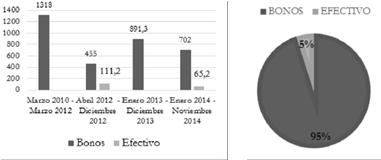 En el siguiente gráfico se puede verificar el porcentaje que, entre el período 2010-2014, fue cubierto con bonos estatales entregados, como lo afirma Mónica Orozco, a 10 o 12 años de plazo, con una tasa de interés del 7% u 8%, aquello significa que estos compromisos de pago deberán hacerse efectivos a partir del año 2022.” (Borja, 2018, p. 87).