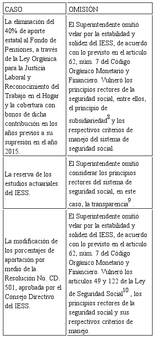En concordancia con esta disposición, el artículo 18 de la Ley de Seguridad Social (2001), establece que el Estado deberá garantizar el buen gobierno del Seguro Universal Obligatorio, administrado por el IESS, a través de la Superintendencia de Bancos; para ello, el cuarto inciso del artículo 306 íbidem dispone que la Superintendencia de Bancos “controlará que las actividades económicas y los servicios que brinden las instituciones públicas y privadas de seguridad social, incluyendo los fondos complementarios previsionales públicos o privados, atiendan al interés general y se sujeten a las normas legales vigentes.”; sin embargo, como fue detallado en los párrafos que anteceden, la máxima autoridad de esta entidad, en el período analizado, habría incurrido en varias omisiones que habrían sido el fundamento del Consejo de Participación Ciudadana y Control Social Transitorio, para el cese de sus funciones como Superintendente de Bancos.