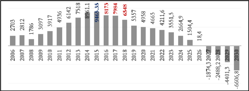 Las resoluciones No. CD. 507, CD. 545, CD. 567 y CD. 581, del Consejo Directivo del IESS, referentes a los presupuestos para el 2016, 2017, 2018 y 2019, son claras al determinar que los ingresos (aportes) del Seguro de Invalidez, Vejez y Muerte, son inferiores a los egresos (gastos prestacionales); por esa razón, han tenido que realizar “recuperaciones de inversiones”. En este sentido, esta situación lo único que evidencia es la insuficiencia de recursos en este Fondo (déficit de caja), situación que se ha presentado desde el año 2014, tal y como resalta el Memorando Interno No. IESS-DSP-2015-0001-M, de la Dirección del Sistema de Pensiones y consta en el siguiente gráfico: