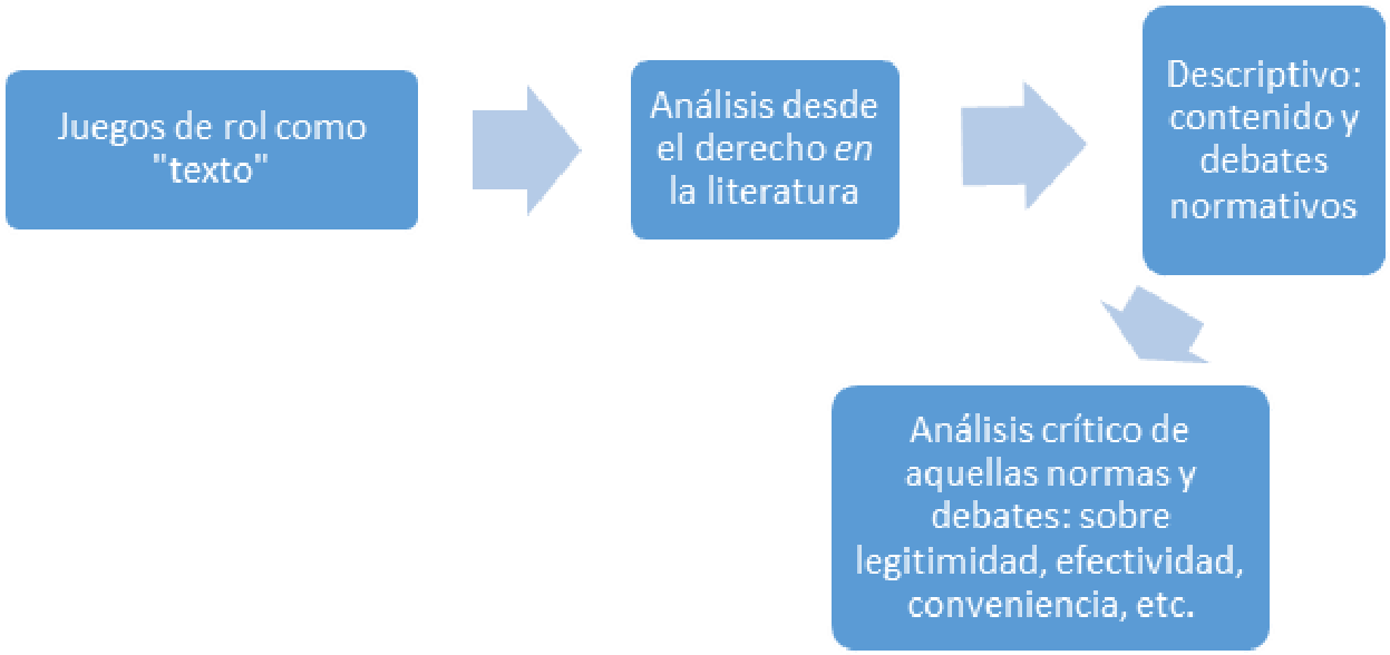 Los análisis teóricos del derecho y la literatura son perfectamente aplicables a los juegos de rol, en cuyas sesiones de juego pueden presentarse problemas jurídicos latentes, proyectados de forma intencional o no por parte de autores, narradores y jugadores. Estos últimos pueden “experimentar”, enfrentar gracias a la amplia agencia que otorgan los juegos de rol, o discutir en términos de legitimidad y efectividad, problemáticas de regulación de conductas.