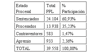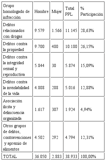 Para lo planteado en esta investigación es de interés que más que el 50 porciento de las PPLs están en las cárceles por delitos relacionados con drogas y por delitos contra la propiedad.