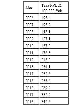 Estas cifras muestran el incremento de la cifra de personas privadas de libertad (PPL) en el Ecuador a partir del año 2012, mientras entre 2008 y 2011 se ha reducido el numero de PPL por 100 000 habitantes.