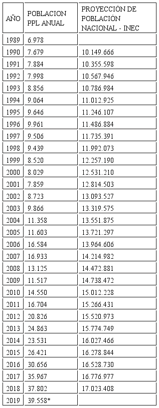 Esta tabla muestra las cifras en absoluto. En los últimos cinco años, la población cancelaría en el Ecuador ha crecido por por 16.028 en total y por lo tanto, un aumento anualmente de 3.205,6 personas. Suponiendo este incremento, tendremos 42.362 Personas Privadas de Libertad en el año 2020 y 67.600 en el año 2029, mientras en el año 1989 eran 6.978 personas. De allí se puede concluir que las reformas procesales penales han iniciado no solo un proceso, sino toda una lógica punitiva. (Lógica punitiva en el sentido de que la privación de la libertad masiva llegó a ser la respuesta “natural” de la sociedad ante una supuesta (percibida) inseguridad).