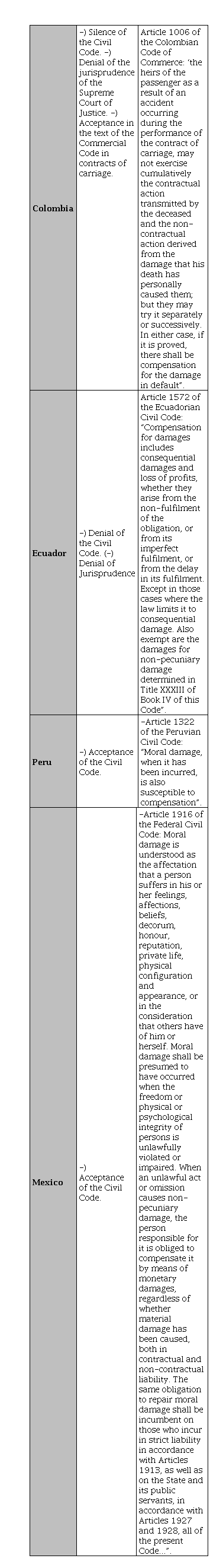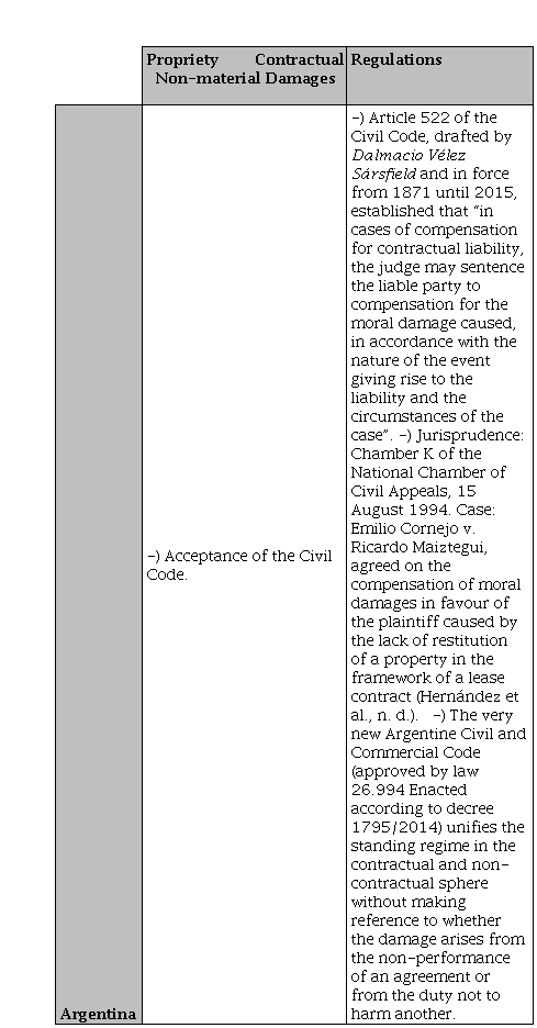 The materialisation of the incorporation of these new currents in the local legal instruments is a fact that has been manifesting itself in the codification of the civil rules for some years now. The discussion on the applicability of this proposition has been left in the past in the legislations of some Latin American countries, today their Codes adopt a new category of damage in the contractual sphere, writing one more chapter in the legal history of civil liability, which will serve as a basis for the members of the legislative power of other nations to replicate their example and formalise what is happening in the seat of their courts, taking into account the essence and function that has kept this institution in force to date.