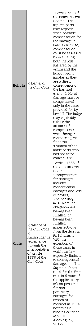 It is evident from the foregoing that in Latin American comparative law, in most countries, the thesis that denies compensation for non-pecuniary damage for breach of a contractual obligation has been overcome; however, the jurists and judges of some countries still hinder the opening of this thesis. Thus, three fixed positions can be identified: i)the express recognition in the Civil Codes or in special local laws; ii) the taxing civil regulation that delimits assumptions in which an action for compensation for non-pecuniary damage is applicable in certain contracts; iii)the admission and development of jurisprudential criteria by virtue of the absence of legislation on the matter; and, iv)the express prohibition in the legal bodies.