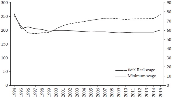 Interestingly, the evolution of the IMSS formal sector wages and the minimum wage is not radically different. Figure 2 plots both the minimum wage and IMSS formal wage rates, from 1994 to 2015 in pesos of 2010. It is clear in this graph how both wage rates were heavily hit by the 1994 peso devaluation and subsequent recession in 1995. However, following this shock, IMSS real wages started to recover slowly, reaching a real higher level than in 1994 only by the beginning of 2015.4 Meanwhile, the minimum wage has stabilized below its 1994 level and under $60 real pesos since 2003.
