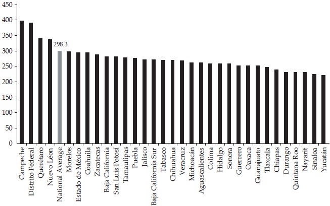The first of the facts left aside by Krozer, Moreno and Rubio (2015), and many others in the debate about the minimum wage, is that of the regional differences that exist across Mexico. While wages in Mexico differ across the country, there are only two official geographical wage areas, A and B, recognized by Comisión Nacional de Salarios Mínimos (CONSAMIN).1 The differences between the two official rates are very subtle. In order to appreciate the true difference of wages across Mexico, the use of other wage measures is more appropriate. In Figure 1 we observe the daily wage received by permanent and temporary formal workers affiliated to Instituto Mexicano del Seguro Social (IMSS) during July 2015.2 The first striking fact to notice is that, at nearly 300 pesos, the average national salary is way above the minimum. There is roughly a five-fold differ- ence with respect to the minimum wage of $70.1 and $68.28 pesos in areas A and B, respectively. Second, even though the IMSS salaries are for workers in the formal sector, the difference between the extremes is remarkable. The daily salary in Campeche is 80% higher than in Yucatán; in Querétaro 52% higher than in Sinaloa.3 Third, in Distrito Federal, the salary is 51% and 58% higher than in the neighboring states of Hidalgo and Tlaxcala, respectively. Indeed, other factors like the differences in workers’ skills and education play a role in the unequal distribution of wages across Mexico.