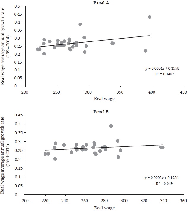 One way of looking at how regional differences have evolved over time is by assessing absolute wage convergence. As in the neoclassical economic growth literature, the idea behind the simple analysis proposed here comes from the fact that states where income is low might see higher rates of growth in wages over time relative to those states with somewhat higher wages, leading to a convergence process. In order to revisit this hypothesis, Figure 3 panel A plots the aver- age real growth rate of IMSS wages against the real wage rate in 2014. For the plot to suggest convergence, a negative sloped line is expected to emerge from fitting a linear regression, implying that states with smaller wage rates are also those that are growing faster. However, the regression line shows a positive slop which is rather consistent with wage divergence. Panel B in Figure 3 is similar to Panel A, but excludes Campeche and Distrito Federal from the sample.5 As can be observed, excluding these potential outliers does not significantly affect the slope of the regression line. While the absolute convergence analysis presented here is rather simplistic, addressing the issue of regional wage differences across Mexico and the potential divergence of wages is an important matter if the debate that is now taking place mainly in Distrito Federal is generalized to the rest of the country.