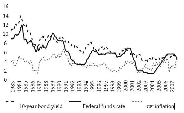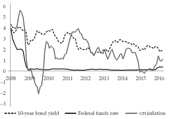 Some commentators have argued that the Federal Reserve is fuelling the next inflation (cf. Meltzer, 2014), and would like to see drastic rate hikes, and, for that matter, the Fed going back to a monetary policy system akin to that of the Great Moderation period, when inflation declined faster than both the if and the 10-year bond yield, except for the sub-period 2002-2005 in the case of the if when the Fed eased monetary policy to fight the dot-com recession (see Figure 2). However, clearly the long-run bond rate outgrew the federal funds rate for most of the Great Moderation period, until they converged on the eve of the outbreak of the Great Recession in 2007.