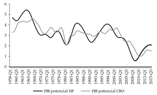 Para verificar la robustez de nuestras estimaciones se estimó el mismo modelo CVAR pero usando el PIB potencial reportado por el CBO y la inflación tendencial que resulta de un VAR bayesiano (Primiceri, 2005). Específicamente, se utilizó un VAR conocido como Time Varying Structural Vector Autoregressions (TVP-VAR) con volatilidad estocástica para estimar la inflación de equilibrio. A continuación se comparan dichas variables con las del modelo original (véanse las gráficas 1 y 2).