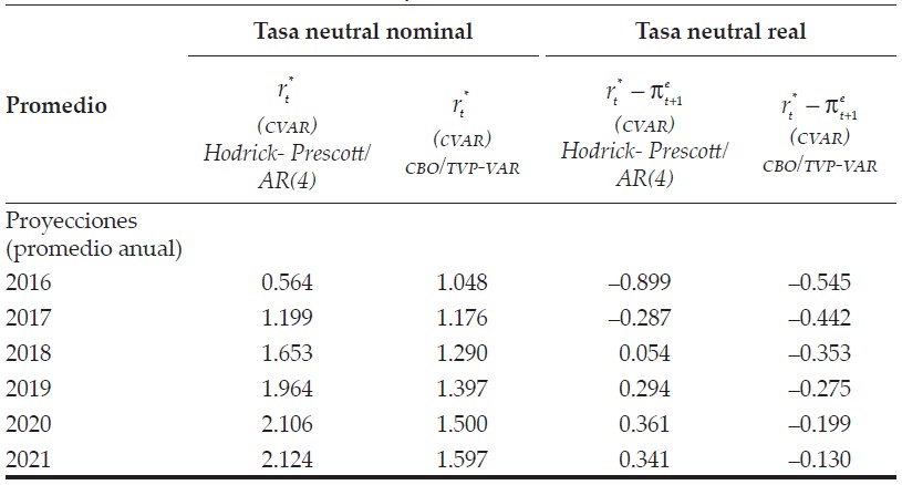 Para verificar lo anterior, se estimó y proyectó la tasa de interés neutral siguiendo exactamente la misma metodología propuesta en el artículo pero usando el PIB potencial del CBO y la inflación de equilibrio del TVP-VAR. Los resultados de las proyecciones se reportan en el cuadro 1.