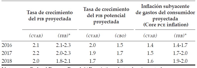 Con la finalidad de ofrecer más certidumbre a los lectores sobre nuestros resultados, a continuación se contrastan las trayectorias futuras de la tasa de creci- miento del PIB real, del PIB potencial y de la inflación que se derivan del CVAR con los pronósticos para las mismas variables publicados por la Reserva Federal y el CBO.