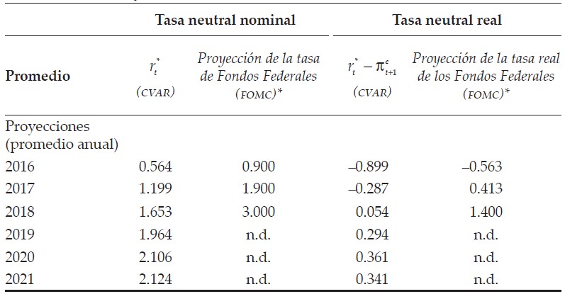 Estas cifras sugieren que la posición de política monetaria que implican las proyecciones de la tasa de corto plazo de la Reserva Federal seria restrictiva si las comparamos con las tasas neutrales derivadas del CVAR. Cabe mencionar que la anterior conclusión puede cambiar si comparamos contra tasas neutrales de un modelo de otra naturaleza.