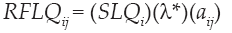 Thus, they developed a reformulation of the FLQ, the RFLQ, Flegg and Webber (1997), which attempted to improve the measurement of the economic size of the region and to avoid the underestimation of regional imports, as well as not allowing the overestimation of the regional multipliers. Hence, the original FLQ was changed, first by improving the estimation of the scalar λ in the original FLQ and second by substituting the crossed holding coefficients, CILQij , with the simple location quotient, SLQi , which is derived as: