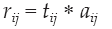 The traditional location quotient ( rij ), as an estimator of regional trade 5 , is a function of the regional propensity to consume ( C ), of the inputs ( j ), bought from national suppliers ( i ), multiplied by the national technical production coefficients ( aij ), which is denoted as follows: