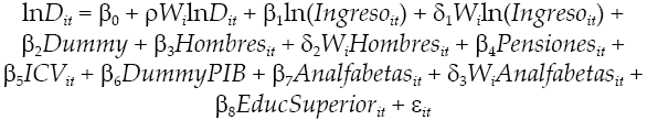 La relación entre ingresos, porcentaje de hombres y delitos se recoge en la forma de variables independientes rezagadas espacialmente. Cuando se realiza este procedimiento se plantea que estas variables afectan directamente los delitos de las comunas vecinas sin necesidad de intervenir primero en sus propios niveles de delincuencia. Ejemplificando, para el modelo Durbin un cambio en el logaritmo de los ingresos por trabajo de la comuna j (siendo j vecina de i ) afecta directamente el nivel de delitos de la comuna i , mientras que para los demás modelos este cambio afecta primero el nivel de delitos de j y posteriormente este nuevo nivel de delitos afecta el correspondiente en i .