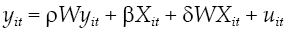 [16]Este modelo, a diferencia del anterior, plantea que sí existe una relación espacial con las características individuales de cada una de las unidades vecinas. Sin embargo, no plantea relación espacial en el término del error. Según este enfoque, los choques espaciales se propagan y generan a través de intervenciones sobre las variables explicativas de interés.