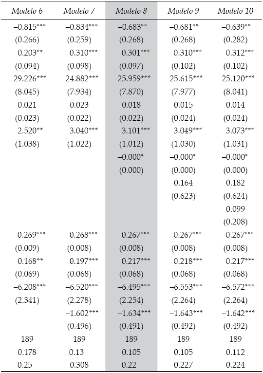 En el cuadro 8 se presentan los resultados de la estimación de los paneles espaciales. Con el fin de escoger el modelo que mejor represente el proceso generador de los datos se llevan a cabo tres pruebas de hipótesis construidas para modelos espaciales (véase el cuadro 9). Se puede concluir que el modelo Durbin, que incluye rezagos espaciales en la variable dependiente al igual que en algunas de las variables independientes, es el que recoge de manera más adecuada el proceso generador de los datos.