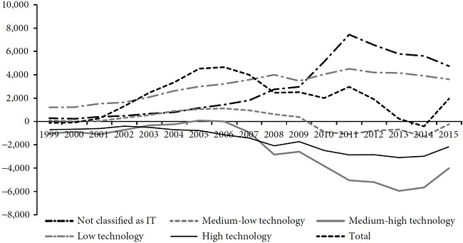 As for the composition of the trade balance, which can be considered an important indicator of the competitiveness of an economy, Brazil’s exports have concentrated in commodities and lower value-added goods (see Figure 2). As is commonly known, the dependence of the economy on the price trajectory of primary commodities and low-tech products is a problem because these are products whose prices and export volume are more sensitive to changes in the international environment. This sensitivity ends up increasing the external vulnerability of the country, especially in times when international liquidity cycles are reversed. Finally, with regard to the negative effects on the manufacturing industry, the real exchange rate appreciation that began in 1994 was associated with a structural change in the composition of national production, resulting in an extreme loss of the industry’s share in the total economy11.