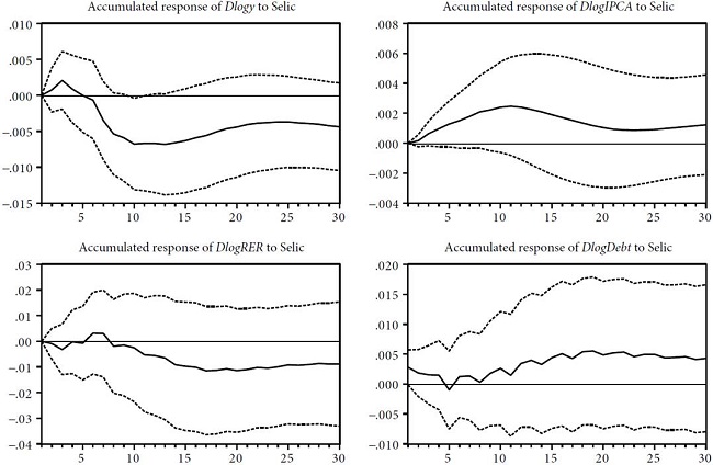 Figure 3 shows an initially negative response in the exchange rate when faced with an increase in the Selic rate, followed by cyclical movements in the exchange rate. The cumulative effect of a shock in the Selic on the exchange rate is negative, as shown in Figure 4. Thus, increases in the Selic contribute to the real appreciation of the exchange rate, a fact which have important effects on the long-term growth, especially in emerging and developing economies, as many authors have pointed out16.