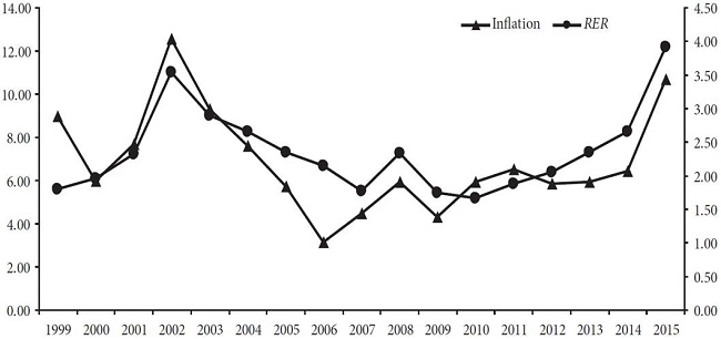 After the adoption of the ITR, however, inflation remained at relatively high levels compared to the world economy average, which was 4.1%. Table 1, below, shows that, over this period, the upper limits of tolerance were missed for the years 2001, 2002, 2003 and 2015 by a substantial margin, especially in 2002 and 2015, while in 2004 the inflation target was only met after it was raised by mid-2003. However, the inflation rates were above the point targets in nine years (1999, 2004-2005, 2008, and 2010-2015).