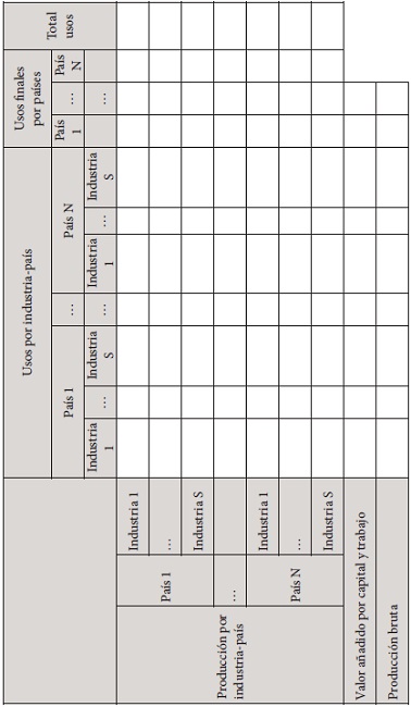 Simplificando, una WIOT es una tabla de doble entrada en la que las columnas proporcionan información sobre las aportaciones de los inputs en los costos totales. Estos inputs pueden ser utilizados como productos intermedios de otras industrias o como productos finales. Por su parte, las filas nos ofrecen la distribución de los inputs por cada uno de los productos acabados de cada sector.