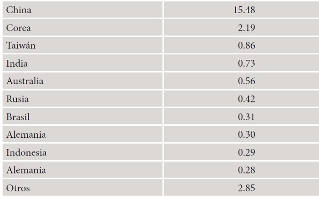 El análisis más pormenorizado de los cambios en la distribución del valor añadido de la industria nos pone de manifiesto que China está siendo la principal beneficiaria del proceso de fragmentación de la producción de uso final elaborada en México, asumiendo un valor preferente en la cadena de valor de la industria electrónica del país (véase el Cuadro 8). Los reducidos niveles salariales de esta economía, su experiencia industrial y las mejoras de cualificación laboral facilitarían que se convierta en uno de los destinos preferentes para la finalización de los productos electrónicos elaborados en el sudeste asiático, probablemente para su distribución en el interior del TLCAN.