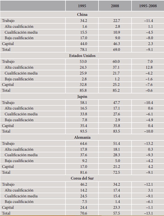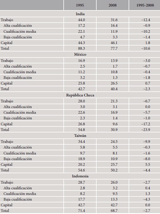 La regresión en el valor añadido nacional de las economías emergentes ha tenido como reflejo una mejor posición relativa del capital, indicio del mejor posicionamiento competitivo de las empresas locales. En contraposición, se observan caídas muy apreciables en la participación del trabajo menos cualificado, particularmente en China, Taiwán y Corea, pero también en India, Indonesia y México.