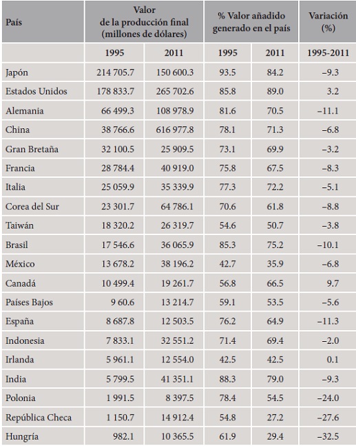 En primer lugar, se constata una tendencia creciente de las estrategias de offshoring a nivel internacional. Mientras que en 1995, para el conjunto de los veinte países analizados, el 82.4% del valor añadido de la producción se retenía en el país de finalización del producto, esta participación retrocede hasta el 72.9% en 2011. Significativamente, en la gran mayoría de países el peso del valor añadido nacional ha disminuido en dicho periodo. Tan sólo las economías con mercados internos de mayor dimensión son capaces de retener, al final del periodo, una participación dominante del valor generado. Es el caso, principalmente, de Estados Unidos, Japón, India o Brasil. En contrapartida, las economías de menor dimensión suelen mostrar menores tasas de generación interna de valor añadido.