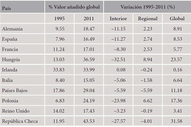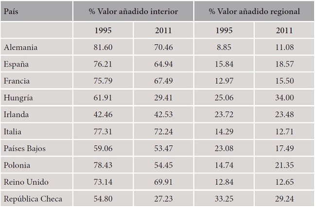 En todos los casos analizados la participación del valor añadido generado por sus socios regionales ha aumentado durante el periodo, de manera que en 2011 la mayor parte del valor añadido de la industria electrónica europea se originó en el interior de la Unión Europea. La adhesión de las economías de Europa central y oriental al proceso de integración europea en 2004 ha fortalecido el arraigo de las cadenas regionales de valor. Significativamente, es en las economías de Hungría y Polonia donde se observa una transformación más notable en la distribución geográfica del valor añadido, con un intenso crecimiento de la participación de sus socios europeos.
