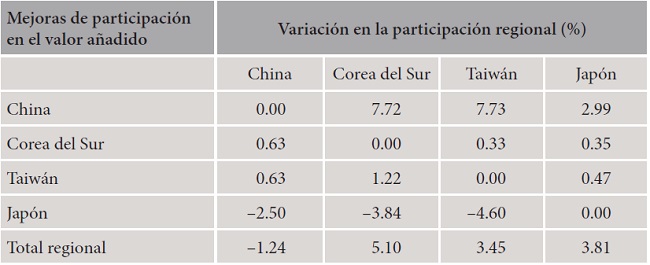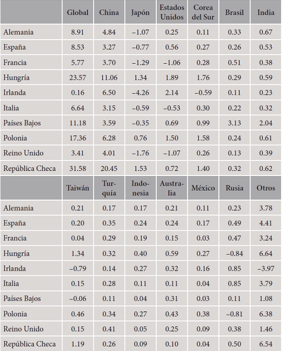 Este resultado es consecuencia de una recomposición de la participación de los distintos países asiáticos. De este modo, descomponiendo los cambios observados en la participación en el valor añadido regional, en el Cuadro 5 se puede observar que tanto en el caso de Japón como de Corea y Taiwán una parte apreciable de la fragmentación del valor se ha realizado en favor de las economías más cercanas, siendo la economía china la principal beneficiada de esta restructuración del valor añadido. La pérdida de influencia de la industria japonesa también tiene su manifestación en el contexto regional. Significativamente, al inicio del periodo analizado Japón lideraba la producción mundial en el sector, mientras que el valor del output es un 30% inferior al final del periodo.