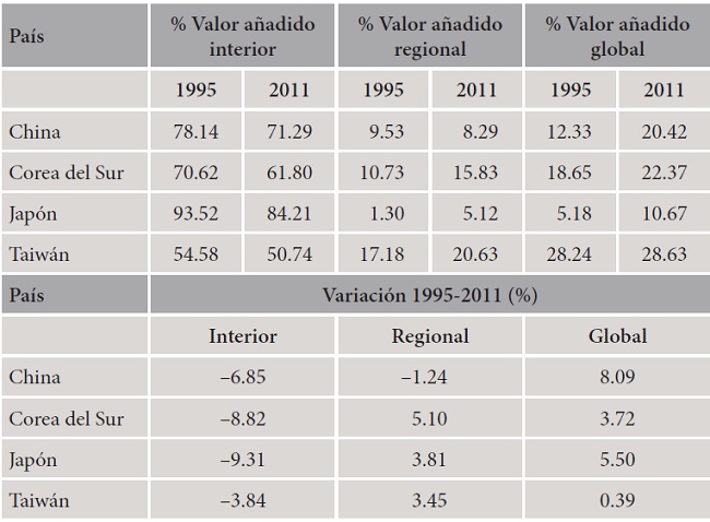 La economía china no sólo se ha beneficiado del intenso proceso de fragmentación productiva del sector al convertirse en una de sus localizaciones preferentes, sino que durante todo este proceso la participación del valor añadido nacional también se ha mantenido en niveles elevados. Un motivo esencial sería la creciente presencia de componentes chinos tanto en la producción que se procesa en el país como en la que se destina a la exportación, tal y como han puesto de manifiesto Koopman, Wang y Wei (2008, pp. 1-51; 2012, pp. 178-189).
