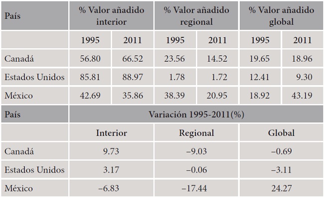 En lo que se refiere a las economías integradas en el TLCAN, se detectan comportamientos heterogéneos entre sus miembros (véase el Cuadro 7). Canadá es la economía que ha mejorado más sensiblemente la participación del valor añadido nacional en su producción total a lo largo del periodo analizado. Esta mejora se ha realizado en detrimento de sus socios regionales, principalmente México.