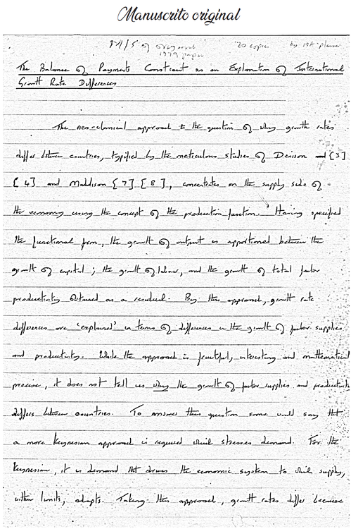 El enfoque neoclásico de la cuestión de por qué las tasas de crecimiento entre países difieren, tipificado por los estudios meticulosos de Denison (1967), Denison y Chung (1976) y Maddison (1970 y 1972), se concentra en el lado de la oferta de la economía usando el concepto de la función de producción. Una vez se especifica la forma funcional, la tasa de crecimiento del producto se prorratea entre el crecimiento del capital, el del trabajo y el de la productividad total de los factores que se obtiene como un residuo. En este enfoque, las diferencias en las tasas de crecimiento se “explican” en términos de las diferencias en los crecimientos de las ofertas de factores y de la productividad. Aunque el enfoque es fructífero, interesante y matemáticamente preciso, no nos dice por qué los crecimientos de las ofertas de factores y de la productividad difieren entre los países. Algunos podrían decir que para responder a esta pregunta se requiere de un enfoque keynesiano que enfatice la demanda. Para los keynesianos, la demanda es la que “dirige” al sistema económico, y a la cual, dentro de ciertos límites, se adapta la oferta. Considerando este enfoque, las tasas de crecimiento difieren debido a que el crecimiento de la demanda difiere entre los países. Entonces la cuestión relevante es la siguiente: ¿por qué la demanda crece a tasas diferentes entre los países? Una explicación puede ser la incapacidad de los agentes económicos, en particular de los gobiernos, para expandir la demanda. Sin embargo, esta explicación no es muy satisfactoria en sí misma. La explicación más probable radica en las restricciones de demanda. En una economía abierta, la restricción dominante es la balanza de pagos. En este artículo se muestra en qué medida el crecimiento experimentado por varios países desarrollados se aproxima a la tasa de crecimiento de las exportaciones dividida entre la elasticidad ingreso de la demanda de importaciones, la cual, dados ciertos supuestos, puede considerarse como una medida de lo que he llamado la tasa de crecimiento de equilibrio de la balanza de pagos. De hecho, la tasa de crecimiento de las exportaciones dividida entre la elasticidad ingreso de la demanda de importaciones arroja una aproximación tan buena de la tasa de crecimiento experimentada desde 1950 por los principales países desarrollados, que casi se podría formular una nueva ley económica.