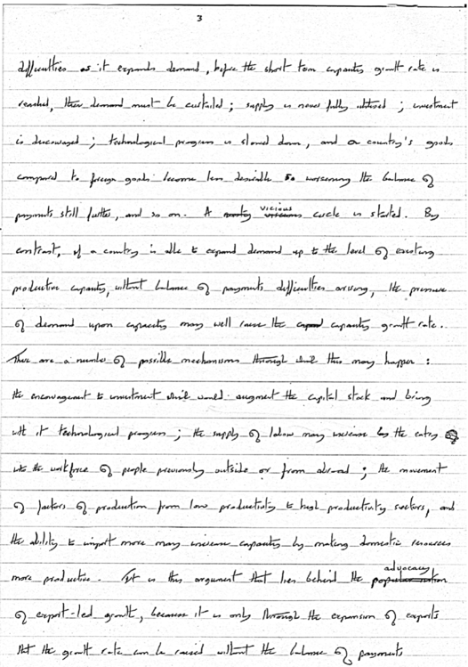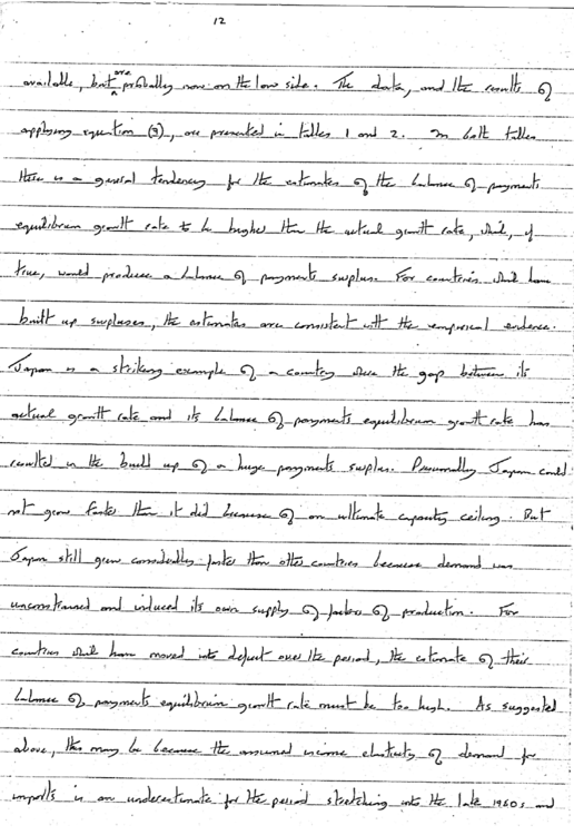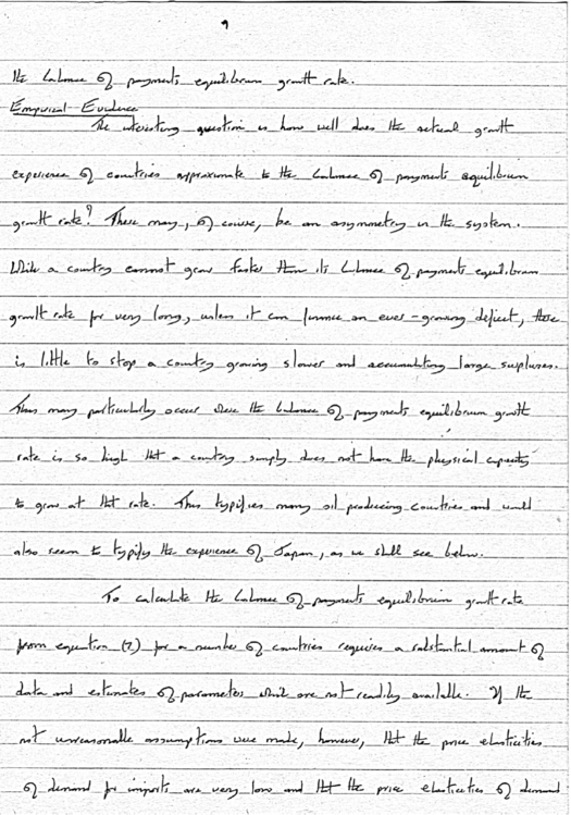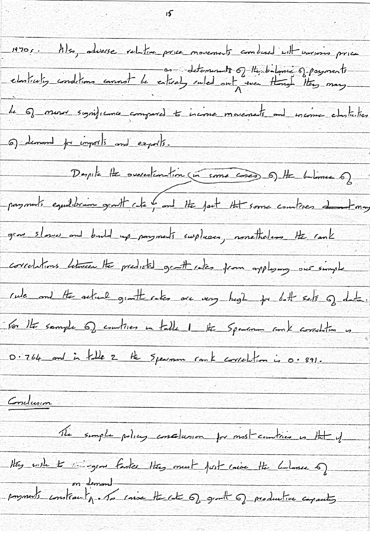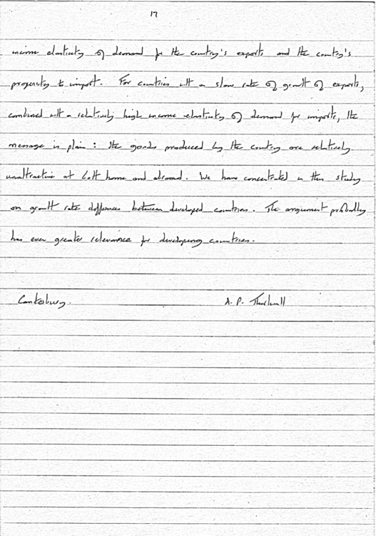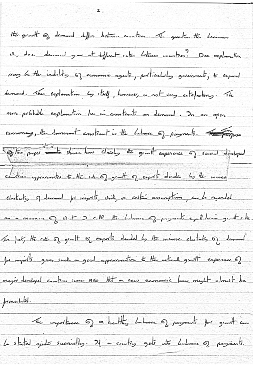 La conclusión de política simple para la mayoría de los países es que si desean crecer más rápido primero deben aumentar la restricción de la balanza de pagos sobre la demanda. Aumentar la tasa de crecimiento de la capacidad productiva (mejorando la productividad, por ejemplo) sin aumentar la tasa de crecimiento de la demanda debido a la balanza de pagos, sólo conducirá al desempleo. Sin embargo, si se puede aumentar la tasa de crecimiento de equilibrio de la balanza de pagos, haciendo que las exportaciones sean más atractivas y reduciendo la elasticidad ingreso de la demanda de importaciones, la demanda se puede expandir sin generar dificultades en la balanza de pagos; y, dentro de ciertos límites, la demanda puede generar su propia oferta al estimular la inversión, absorber el desempleo, aumentar el crecimiento de la productividad y así sucesivamente. Así, la explicación de las diferencias de la tasa de crecimiento debe radicar en primer lugar en las diferencias en la tasa de crecimiento de la demanda, y la principal restricción sobre la tasa de crecimiento de la demanda en la mayoría de los países es la balanza de pagos. Nuestro modelo y la evidencia empírica confieren un fuerte apoyo a quienes proponen el crecimiento liderado por las exportaciones.