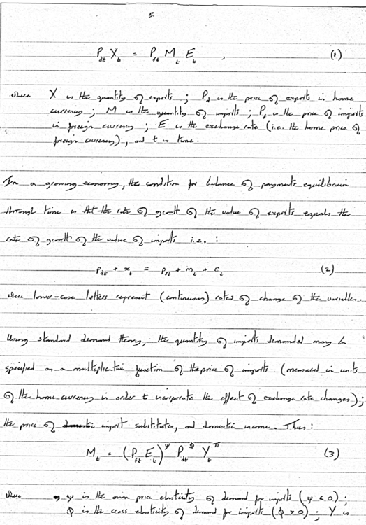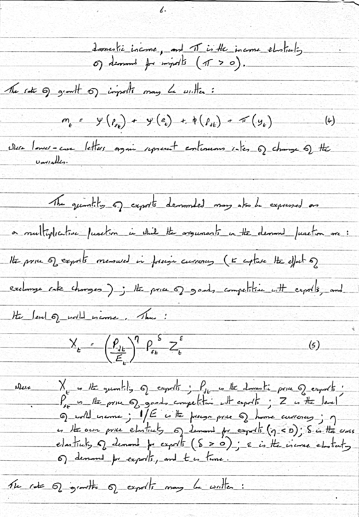 donde X es la cantidad de exportaciones; Pd es el precio de las exportaciones en moneda nacional; M es la cantidad de importaciones; Pf es el precio de las importaciones en moneda extranjera; E es el tipo de cambio (i.e., el precio nacional de la moneda extranjera), y t es el tiempo.