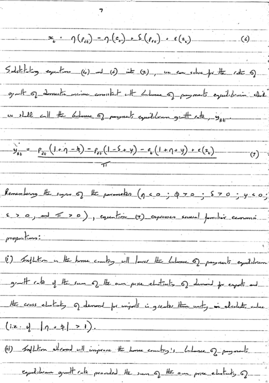 Sustituyendo las Ecuaciones [4] y [6] en [2], podemos resolver la ecuación resultante para la tasa de crecimiento del ingreso nacional consistente con el equilibrio de la balanza de pagos, a la cual llamamos la tasa de crecimiento de equilibrio de la balanza de pagos, yBt :