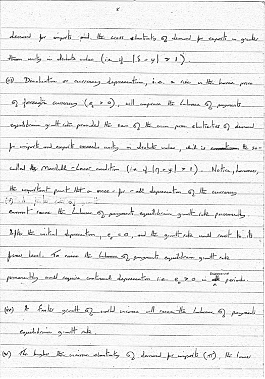 Una devaluación o depreciación de la moneda, i.e., un aumento en el precio nacional de la moneda extranjera (et > 0), mejorará la tasa de crecimiento de equilibrio de la balanza de pagos si la suma de las elasticidades precio propias de las demandas de importaciones y exportaciones excede a la unidad en valor absoluto, que es la llamada condición Marshall-Lerner (i.e., si |η + Ψ|> 1). No obstante, nótese el importante punto de que una depreciación única de la moneda no puede aumentar de forma permanente la tasa de crecimiento de equilibrio de la balanza de pagos. Después de la depreciación inicial, et = 0, y la tasa de crecimiento regresaría a su nivel original. Para aumentar la tasa de crecimiento de equilibrio de la balanza de pagos de forma permanente se requeriría una depreciación continua, i.e., et > 0 en periodos sucesivos.