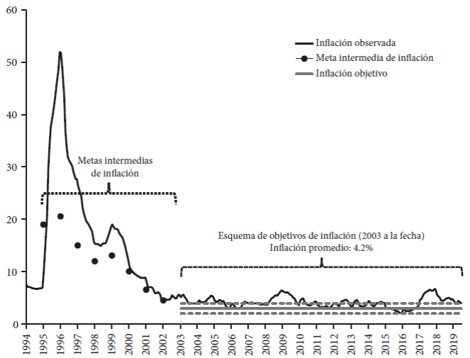 Pese a ello, el esquema de objetivos de inflación se presentaba como una alternativa que facilitaba el manejo de las expectativas de inflación, además de ser compatible con el régimen de libre flotación cambiaria. De esta manera, era importante iniciar un proceso de convergencia hacia niveles de inflación bajos y estables para poder implementar este esquema. El esfuerzo en esa dirección implicaba un fuerte compromiso de la autoridad monetaria, la sociedad y el Estado mexicano. Por ello, se realizaron acuerdos amplios para la estabilización de los precios y la obligación de la autoridad fiscal de mantener un equilibrio razonable en las cuentas públicas. Dentro de este esfuerzo, es destacable el compromiso que se ha mantenido hasta hoy en día de mantener finanzas públicas sanas desde 1994.