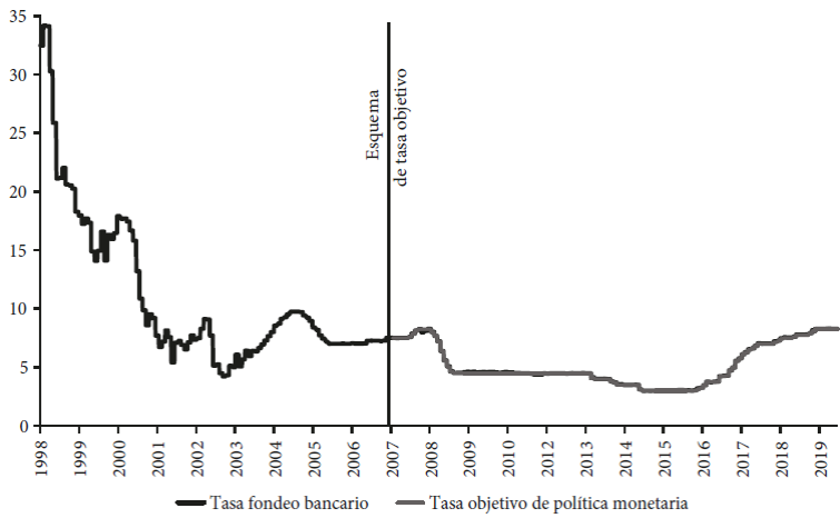 Este proceso de transición culminó el 21 de enero de 2008, cuando el Banco de México comenzó a instrumentar la política monetaria a través de un objetivo operacional para la tasa de fondeo interbancario a un día.19 En este esquema, el Banco equilibra los excesos o faltantes de liquidez del mercado interbancario a través de sus operaciones de mercado abierto. Las condiciones bajo las cuales se realizan estas operaciones, ya sean operaciones de crédito, cuando hay un faltante de liquidez, o de depósito, cuando hay un exceso de esta última, aseguran que se cumpla el objetivo establecido para la tasa de fondeo interbancario a un día.20