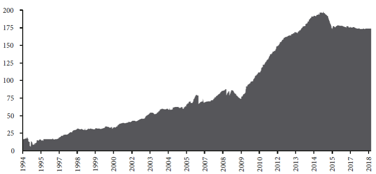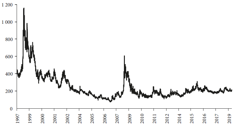 En este sentido, el contar con reservas internacionales que respalden la capacidad crediticia ha mandado una señal de confianza a la comunidad financiera, lo cual en el largo plazo se ha visto reflejado en mejores condiciones de financiamiento y menores costos para todos los agentes económicos de un país.30 Muestra de ello es la reducción del riesgo país medida por el Índice de Bonos de Mercados Emergentes (EMBI, Emerging Markets Bonds Index), el cual, tras una reducción significativa, se ha mantenido en niveles relativamente estables (véase la Gráfica 5).