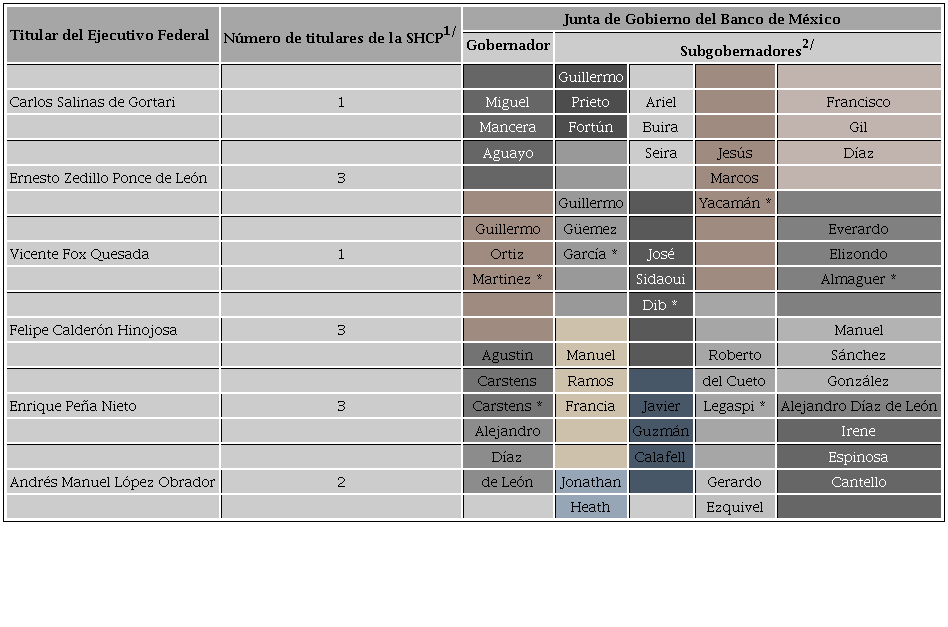 El texto constitucional establece que “el Estado tendrá un banco central que será autónomo en el ejercicio de sus funciones y en su administración”.4 Para alcanzar este fin, la estructura de gobernanza del Banco de México se sustenta en la Junta de Gobierno, la cual está integrada por un Gobernador y cuatro subgobernadores. El proceso de selección de sus miembros es a propuesta del Ejecutivo y con ratificación del Senado de la República, o su Comisión Permanente. Se determinó que la elección de los miembros de la Junta de Gobierno fuera de manera escalonada, a fin de que el ciclo de renovación y la duración de su mandato se efectuara de manera independiente a los cambios de administración del Gobierno Federal. De igual forma, se establece que los miembros de la Junta de Gobierno sólo podrán ser removidos por causa grave y están restringidos a desempeñar otro cargo o comisión, salvo aquellos que estén en representación del Banco o que sean actividades no remuneradas establecidas en el marco jurídico. Esto se ha traducido en que la Junta de Gobierno registre una mayor estabilidad y que los encargados de la política monetaria tengan en comparación una menor rotación que la observada en el caso de los encargados de la política fiscal (véase el Cuadro 1).