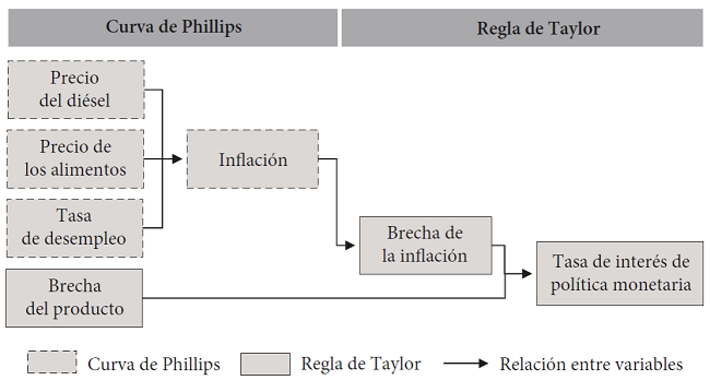 Dado que la tasa de interés neutral () está determinada por la desviación de la inflación respecto a su meta (), se requiere estimar también la ecuación de la curva de Phillips, que incluye los determinantes de la inflación (πt ).